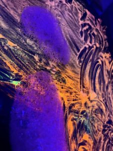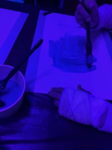 Le plasticien leur propose à la fois des matériaux différents à utiliser mais surtout une expérience sensorielle : visuelle grâce aux lumières et auditive avec la musique qui englobe l’atelier.